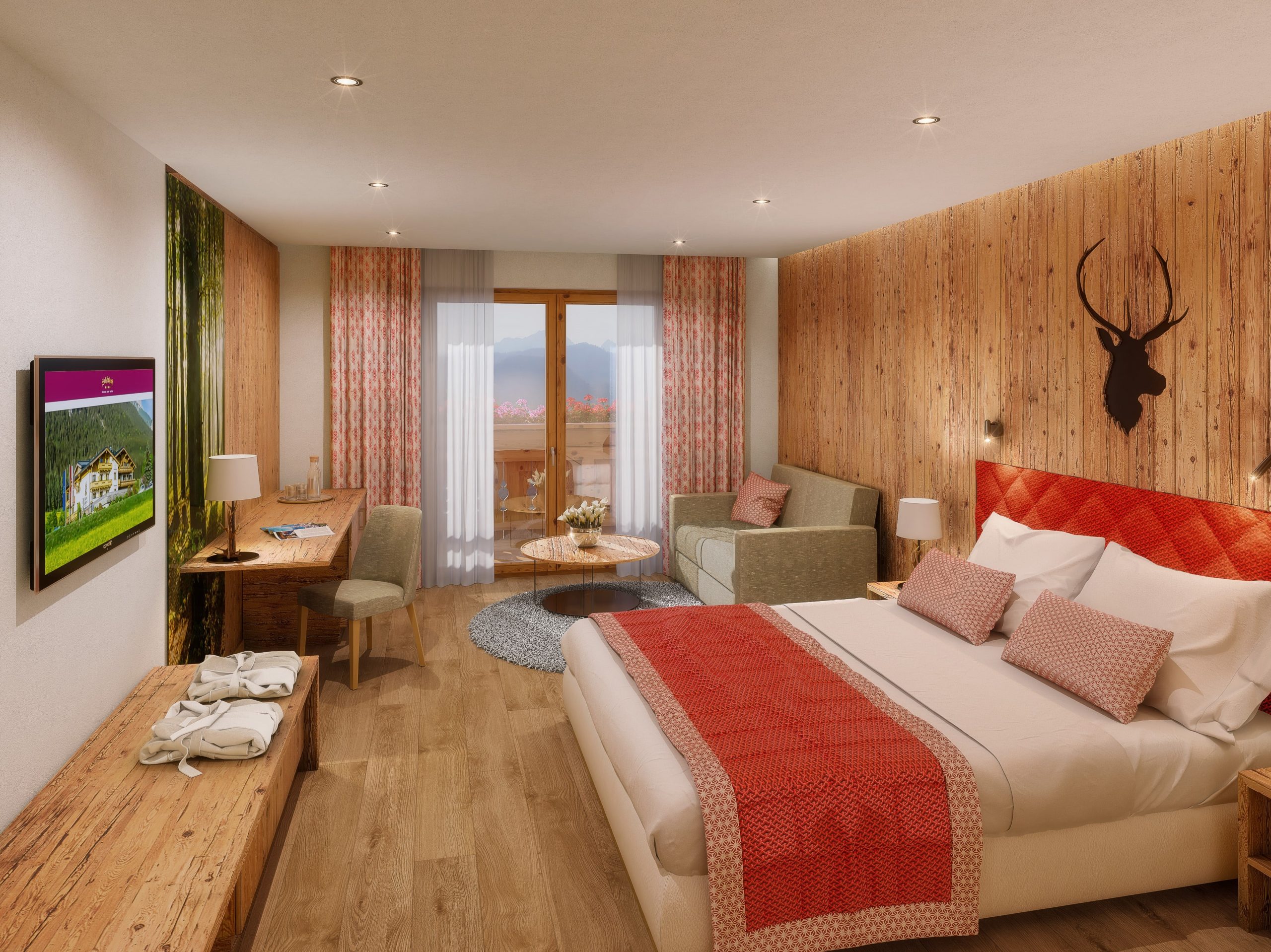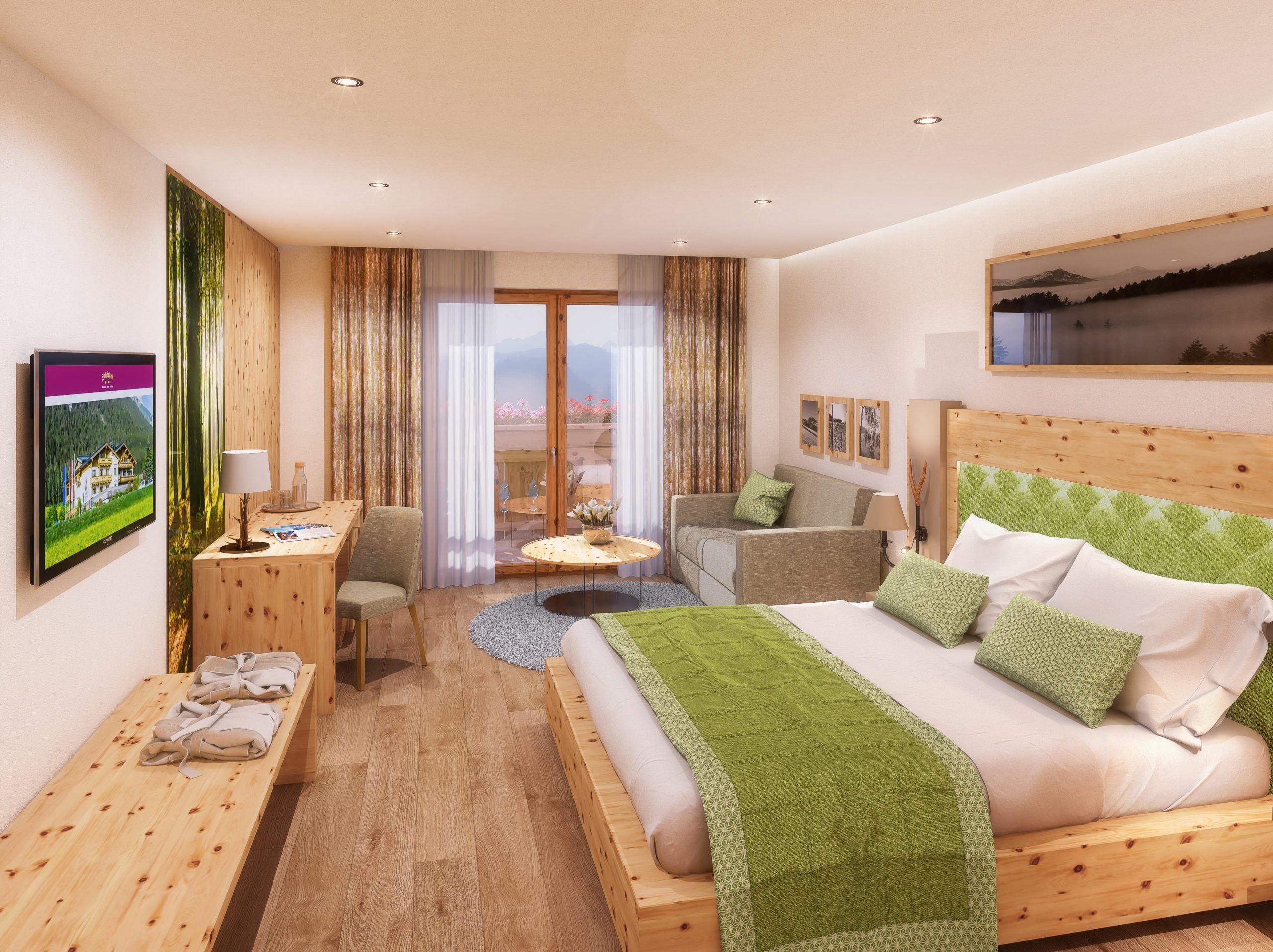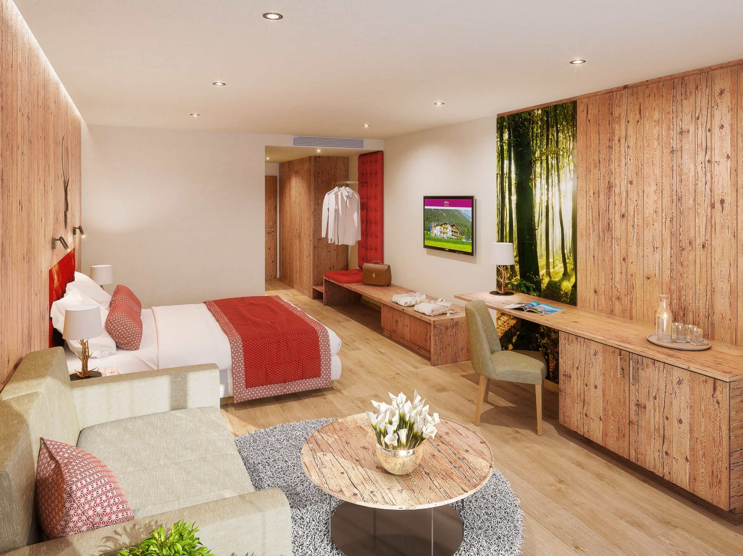 Dazu neu im Angebot: Vier exklusive Zirbenholz-Suiten im eleganten Rot- oder Grün-Akzent in zwei Kategorien – zwei als Juniorsuite Maria Theresia ZIRBE, zwei weitere als Familiensuite Birnhorn: