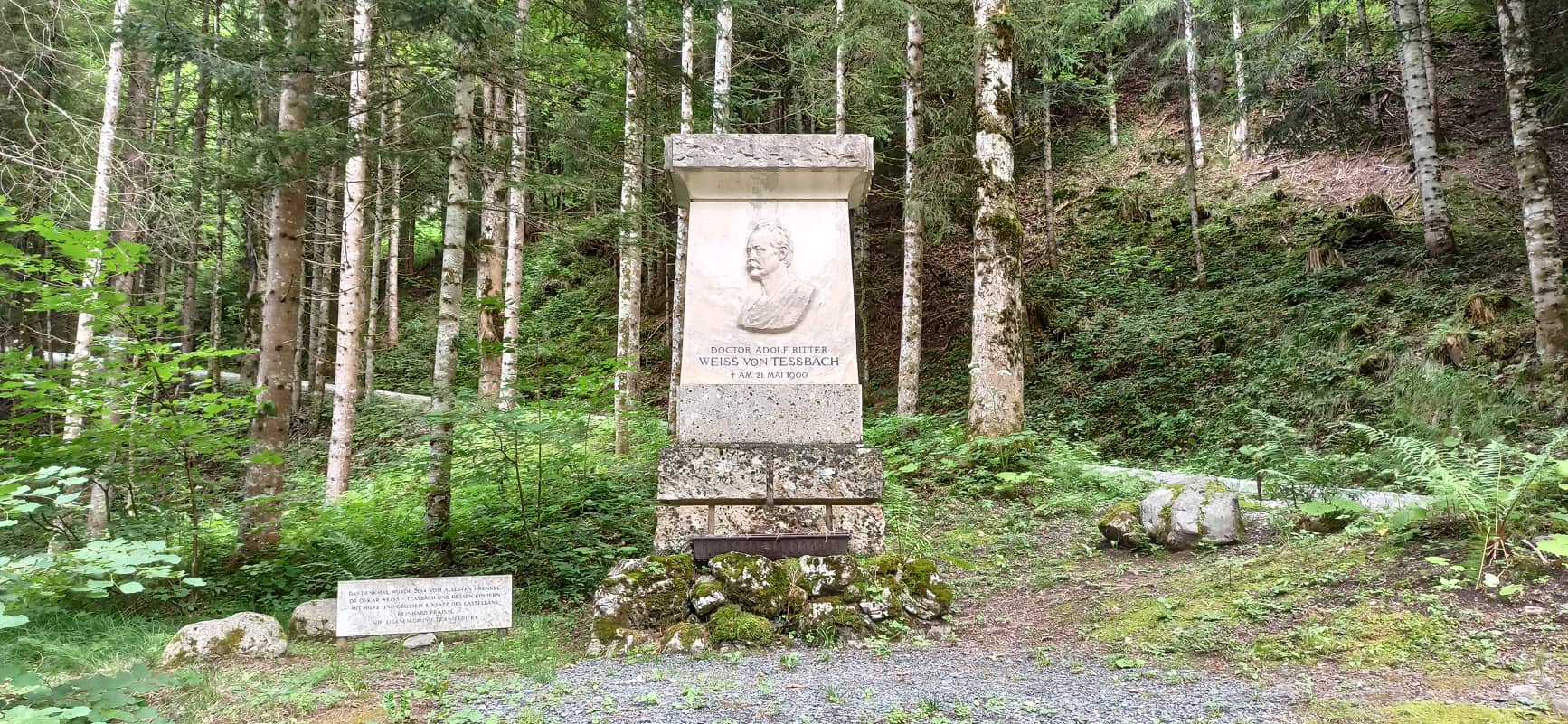 75 Minuten kündigen die Wegweiser an, schon bei der Statue für Doctor Adolf Ritter Weiss von Tessbach – noch ganz am Anfang, quasi im Anschluss an den Parkplatz – soll es nur noch eine Stunde sein. Sehr ermutigend, aber besser realistisch bleiben: So schnell sollte es sich im weiteren Verlauf dann nicht mehr runterspulen. Doch von da an spielt Zeit ohnehin kaum noch eine Rolle. Einmal drin im Wald, vergisst man Eile und Hektik und schnell ist es vor allem der eigene Atem, den man ganz bewusst wahrnimmt, während Schritt für Schritt Höhenmeter geknackt werden.