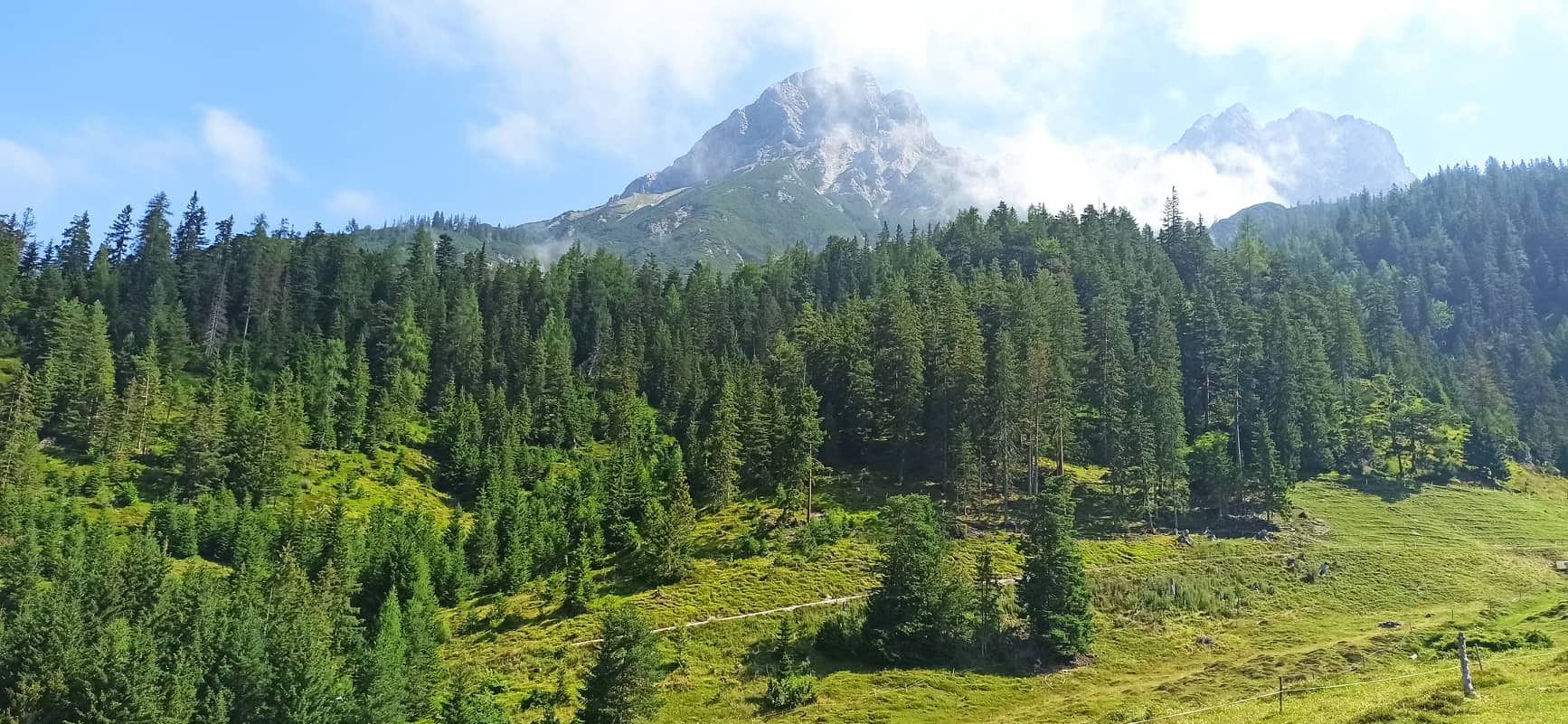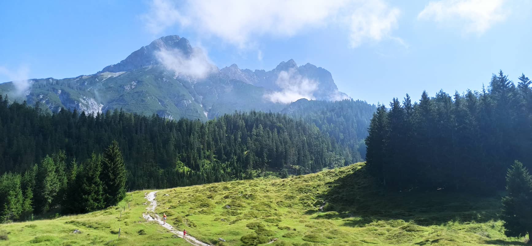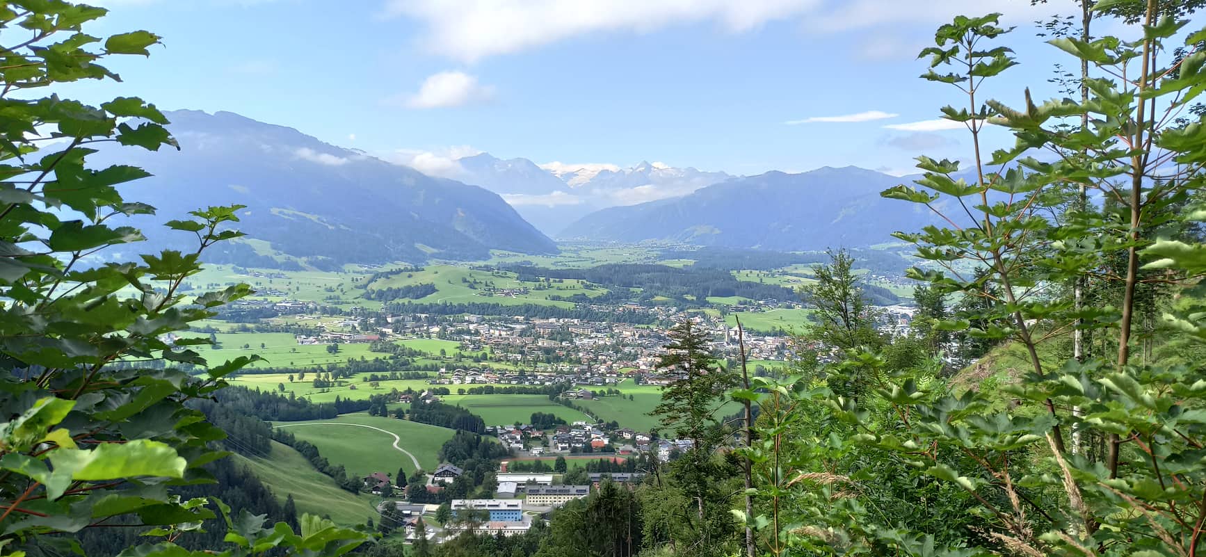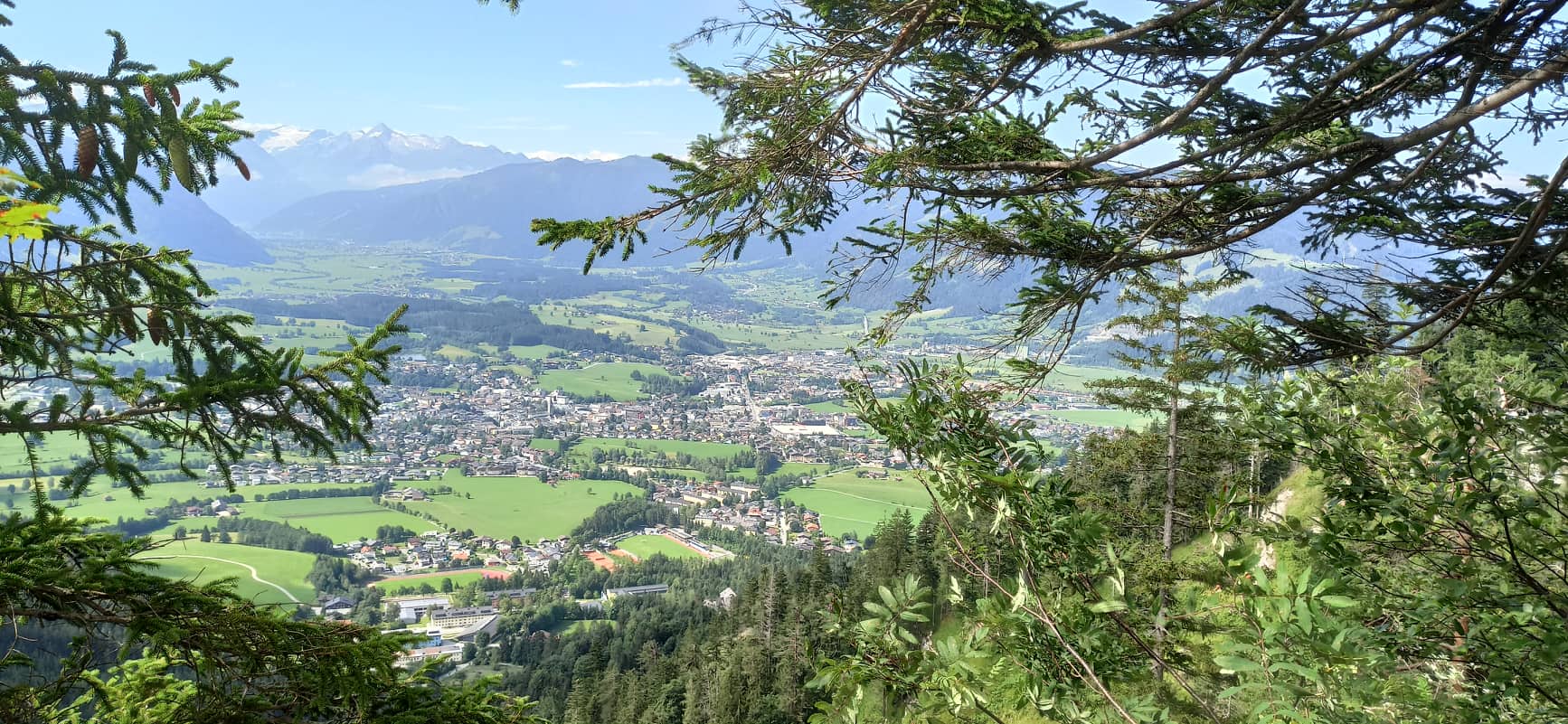 Wir sind jetzt mittendrin in einer familienfreundlichen Wanderung, perfekt für eine intensive erste Tageshälfte. Wer früh genug aufbricht und vorbestellt hat, der kann sich schonmal darauf freuen, oben dann den munteren Tagesstart um 9 Uhr mit einem herrlichen Almfrühstück zu zelebrieren. Doch bis dahin ist es noch ein gutes Stück des Weges. So leicht, so machbar die Route auch ist – es geht durchaus steil zur Sache. Dafür folgt aber auch die Belohnung auf dem Fuß und so erwartet euch bald nach dem Kühloch erstmals eine überragende Aussicht hinunter auf das Saalfeldener Becken.
